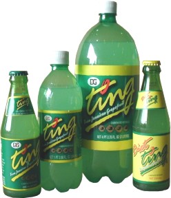 Ting is a carbonated beverage popular in the Caribbean. It is flavored with St. Kitts or Jamaican grapefruit juice (from concentrate), and is both tart and sweet. Ting comes in a green glass bottle, or more rarely in a green and yellow can. The beverage contains a small amount of sediment consisting of grapefruit juice pulp. [Wiki]